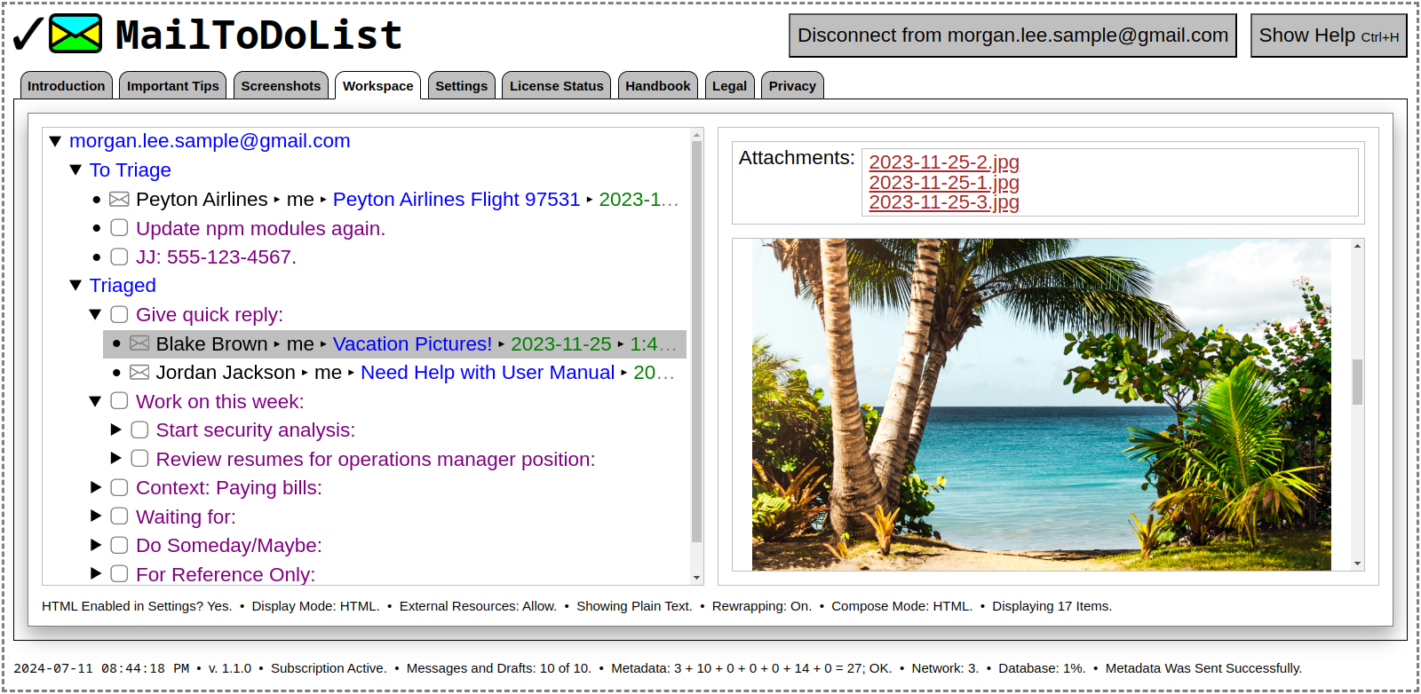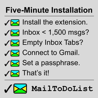 You can be trying MailToDoList for free in less than five minutes.If you have more than about 1,500 emails in your Gmail inbox, you can try MailToDoList, but you won't be able to save your MailToDoList outline until you archive enough messages.